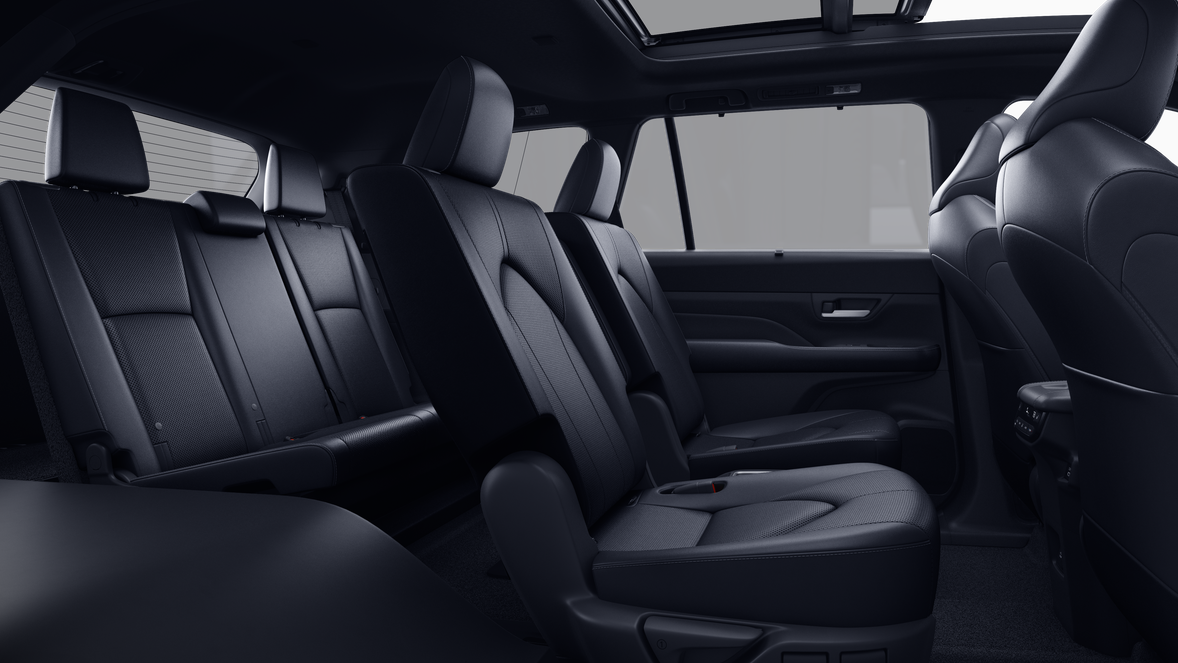 • 7-passenger seating with second-row fold-down captain's chairs and fold-down inboard armrests, adjustable headrests and two cup holders mounted on the floor; and 60/40 split, fold-down third-row seats with sliding headrests and recline function