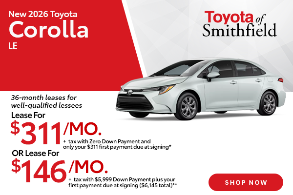 Lease a New 2026 Toyota Corolla LE for $311/mo with $0 down payment and only your first payment due at signing OR for $146/mo with $5,999 down payment plus your first payment due at signing (STOCK# 260665, TSRP $25,423): *Lease for $311/mo with $0 down payment and $311 (first monthly payment) due at signing. **Lease for $146/mo with $6,145 ($5,999 down plus your $146 first payment) due at signing. ALL LEASE OFFERS: Closed end lease. 36 months, 10,000 miles/year. Sales tax additional. Bank acq fee, $420 doc & title prep fees, title and registration fees included in monthly payments. No security deposit required. Lease end buy option $16,779. See dealer for complete lease details. Cannot be combined with other offers. Available to well-qualified lessees, not all will qualify. Take delivery by 03/31/2026.